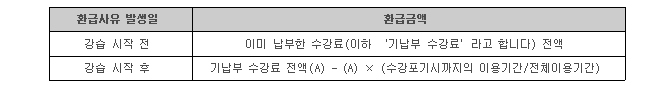 ¨è ±³À°¿øÀÌ Á¦1Ç×ÀÇ »çÀ¯·Î °è¾àÀÇ ÇØÁö¸¦ ÇÑ °æ¿ì, Áöü¾øÀÌ Á¦25Á¶ Á¦2Ç× Á¦2È£¿¡ ÇØ´çÇÏ´Â ±Ý¾×À» ÇнÀÀÚ¿¡°Ô ȯ±ÞÇÕ´Ï´Ù. ´Ü, ÀÌ °æ¿ì ±³Àçºñ ¶Ç´Â ½Ç½ÀÀç·áºñÀÇ ¹Ýȯºñ¿ëÀº ÇнÀÀÚ°¡ ºÎ´ãÇÕ´Ï´Ù.