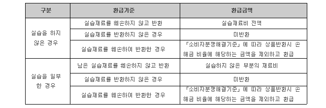 2. ÇнÀÀÚµîÀÌ ±³Àçºñ¸¦ ³³ºÎÇÑ °æ¿ì ±× ±³Àçºñ Àü¾×. ´Ù¸¸ ÇнÀÀÚµîÀÌ ÀÌ¹Ì ¼ö·ÉÇØ°£ ±³À縦 ¹ÝȯÇÏÁö ¾Ê´Â °æ¿ì¿¡´Â ±× ºñ¿ëÀ» ȯ±ÞÇÏÁö ¾ÊÀ¸¸ç, ÈѼÕÇÑ °æ¿ì¿¡´Â °øÁ¤°Å·¡À§¿øÈ¸ °í½ÃÀÎ ¡¸¼ÒºñÀÚºÐÀïÇØ°á±âÁØ¡¹¿¡ µû¶ó »óǰ¹Ýȯ½Ã ¼ÕÇØ±Ý ºñÀ²¿¡ ÇØ´çÇÏ´Â ±Ý¾×À» Á¦¿ÜÇϰí ȯ±ÞÇÕ´Ï´Ù.